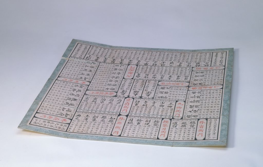 「升官圖」為清宮流行的遊戲品,用硬紙板製作,紙板外用明黃紙裱面,內托裱「升官圖」遊戲圖案。整圖由數張小分圖組成,獨立包邊後再整體黏合。圖展開後大如棋盤,折疊後小如書冊,裝入函套。函套用明黃雲紋暗花綾裱飾,正面左上方繪豎向長方框,內墨書“升官圖”3字,附有鼻、扣別。折疊式「升官圖」適於攜帶,取用方便,可隨時取出博戲。