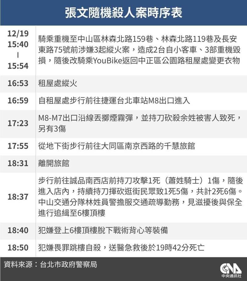 [NOWnews今日新聞] 27歲嫌犯張文於2025年12月19日下班尖峰時段,先後在台北車站與中山商圈一帶投擲煙霧彈,並持刀隨機砍傷路人,最終墜樓身亡。整起事件共造成包含嫌犯在內有4人死亡、11人受傷,經警方深入調查發現,張文生前並未受到「校園與軍中霸凌」,且根據其雲端資料顯示,在計劃犯案的一年半當中,他從縱火、丟煙霧彈、休息、用餐時間都安排妥當,但唯獨沒規劃逃生路線,因此警方認定張文將這場隨機殺人案,視為一場有去無回的終極計畫,並列出四大行動步驟,確認誠品六樓頂樓就是張文的「終點站」。