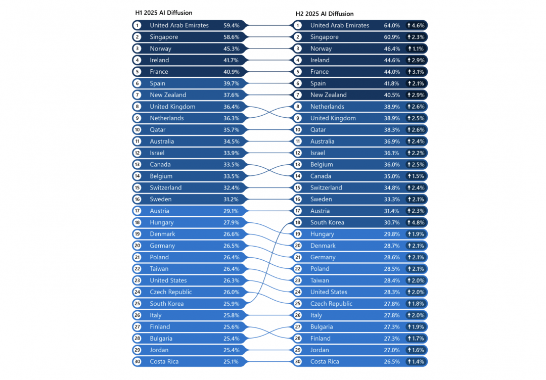 各國之中,成長速度最高的是韓國,短短半年內,使用率從25.9%躍升至30.7%,排名更從第25名一口氣暴衝至18名。背後原因除了韓國政府大力推動AI政策外,AI模型的韓文處理能力明顯進步,以及不少貼近日常生活的應用推出,讓整體AI使用率快速拉升。目前韓國已成為ChatGPT全球第二大使用國家。
